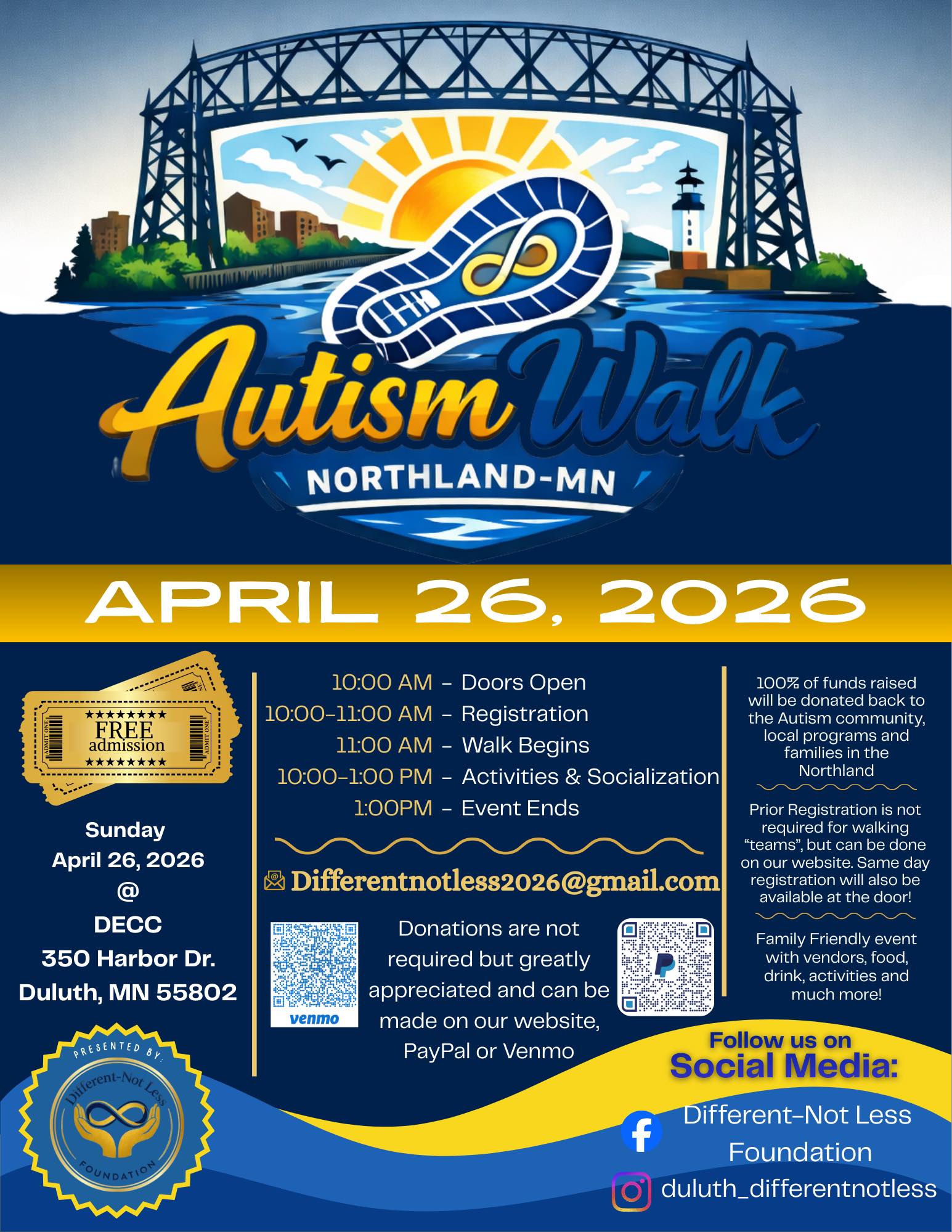 This event is proudly hosted by the Different-Not Less Foundation! Be sure to find and follow them on Facebook. You can also find event updates and details on Autism Walk Northland-MN on Facebook.