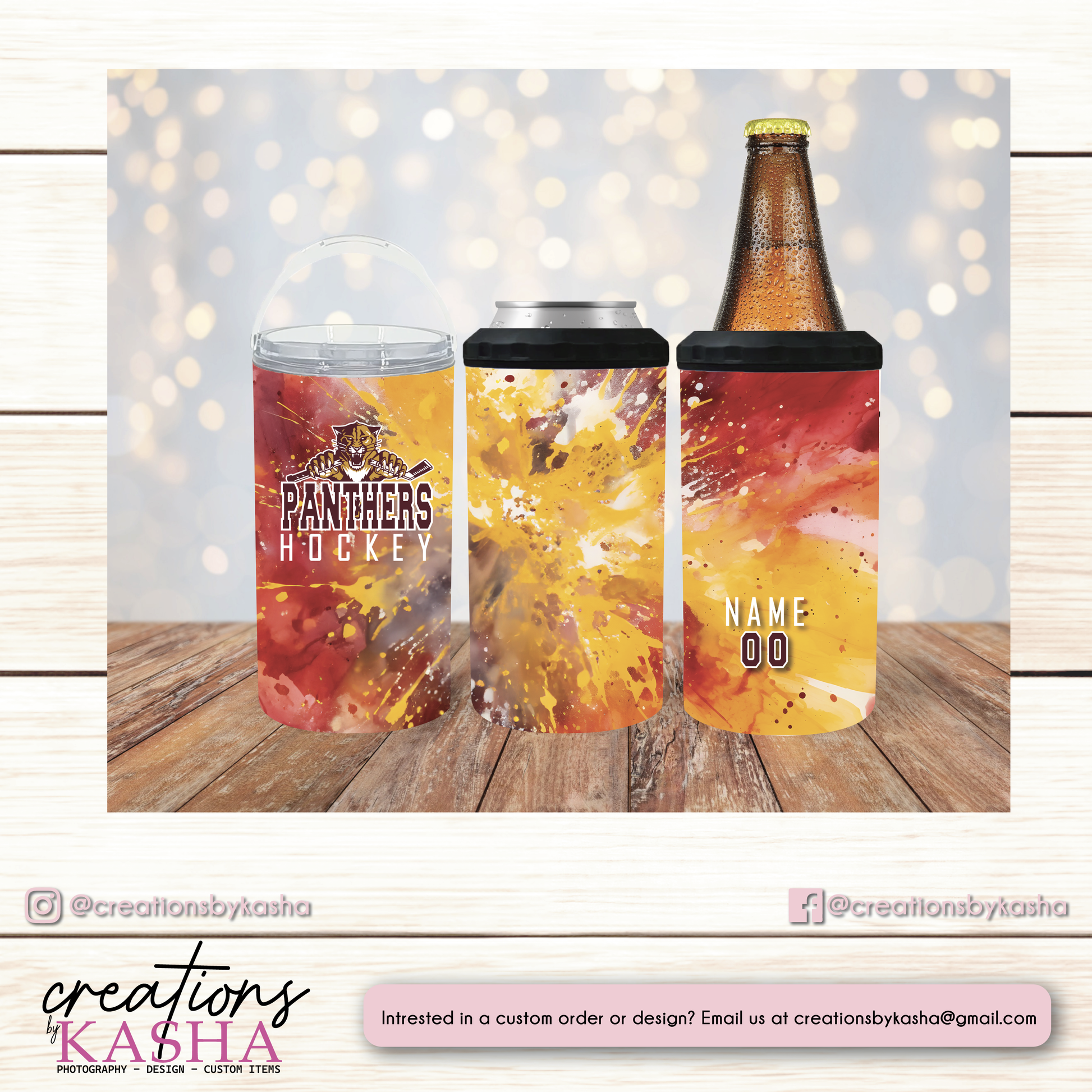 Panther 4 in 1 Koozies offer versatile beverage insulation, comfortably fitting regular cans, skinny cans, and bottles. Equipped with a lid, they transform into tumblers that keep drinks cold or hot while protecting your hands from extreme temperatures. Ideal for showcasing your spirit, these koozies combine practicality with style, making them a popular choice for any occasion. Personalization on these is included OR put NONE if you would like to leave it off.