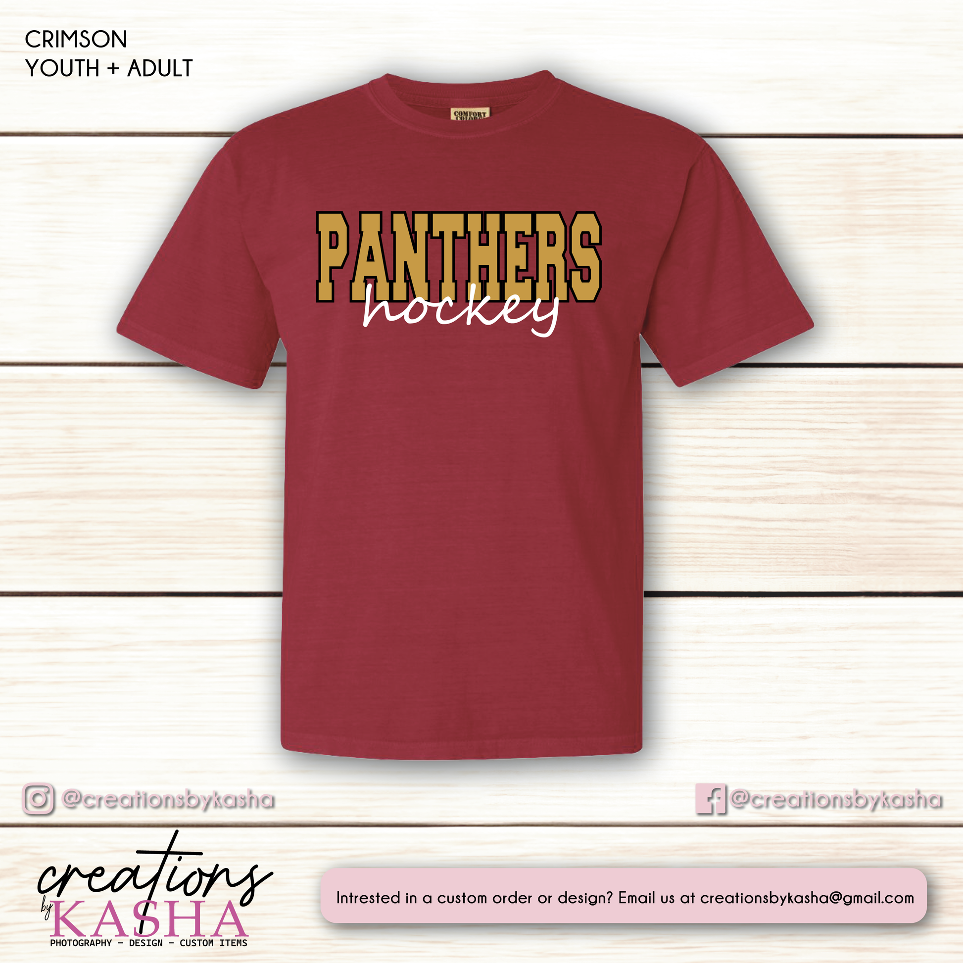 The Panthers Hockey T-shirt features your choice of two distinctive designs: the classic Panthers Cursive or the dynamic Stacked Hockey, both printed on a vibrant crimson shirt. Available in youth and adult sizes with true-to-size fits, this tee ensures comfortable wear for all fans. Additionally, adult sizes come in a gold option, offering a stylish alternative while representing your team pride with quality and comfort.