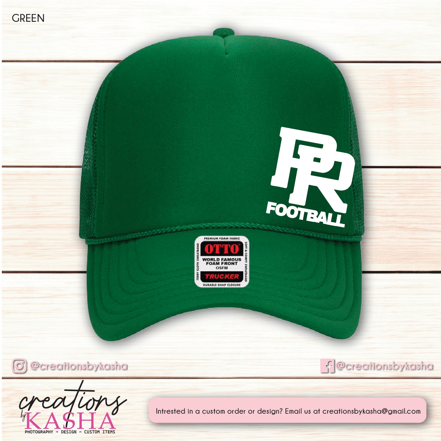 The Otto Brand snapback trucker hat features the PR Football on the left side. Choose from either green/white or green color options.