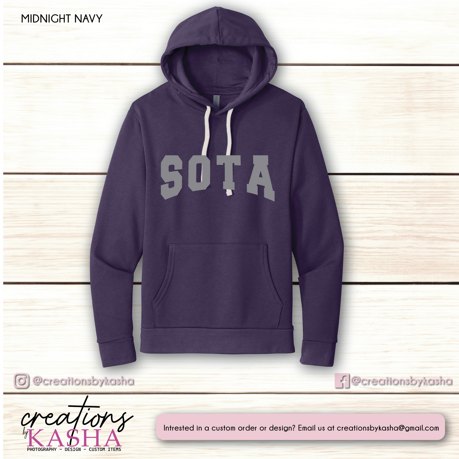 Sota printed in a contrast color on the Next Level Brand unisex hoodie. These are so soft and comfortable. Run true to size. If you want a tighter fit, size down or if you want a lil baggie fit, size up.
