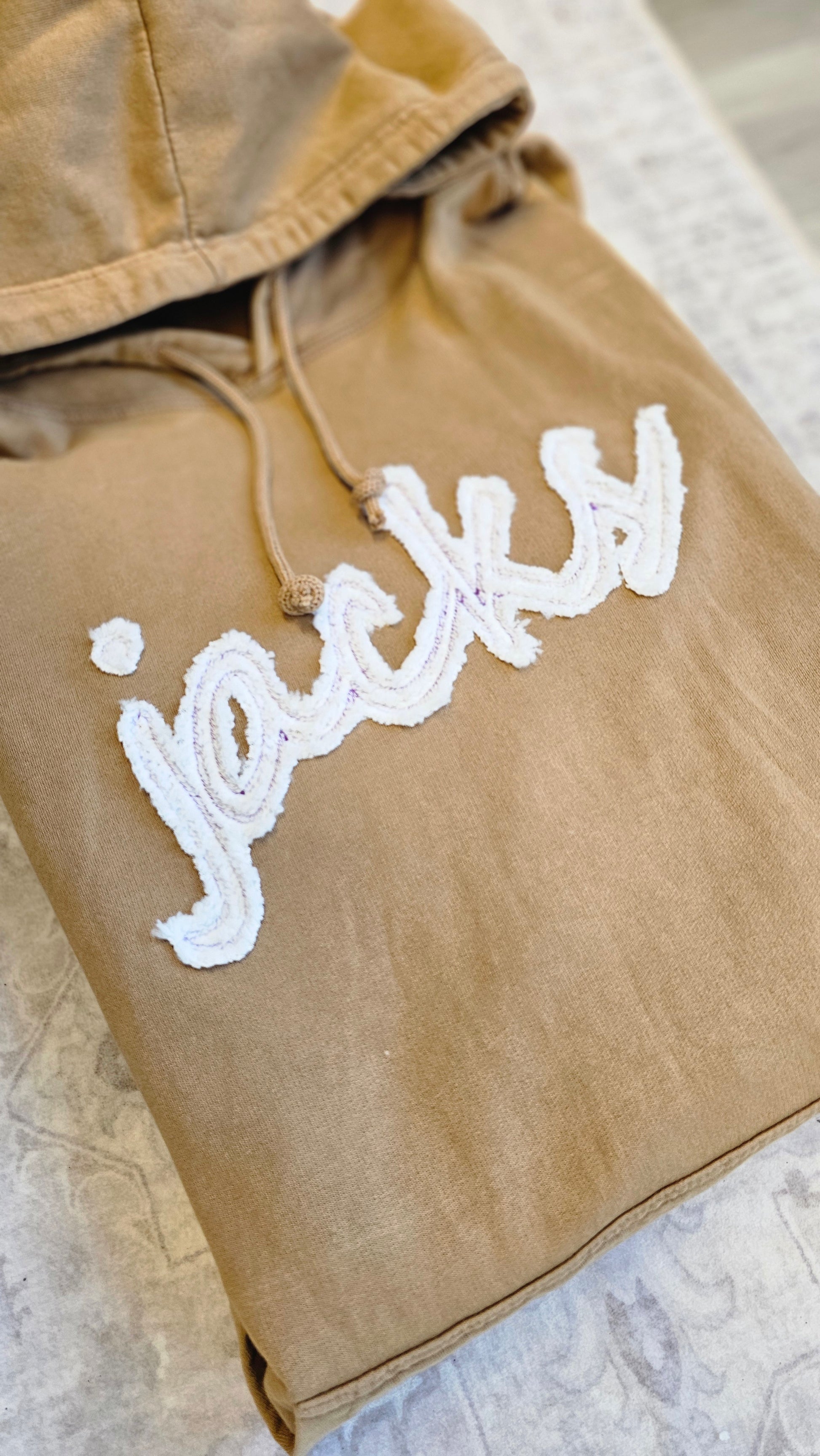 Rock your school spirit in this one-of-a-kind Vintage + Cozy Jacks Hoodie! Choose between rich purple or mustard tones, each featuring authentic acid-washed styling and a perfectly relaxed fit. Crafted from irresistibly fuzzy fabric, every hoodie is hand-cut after embroidering—meaning no two are exactly alike. Slight variations in cuts and finishes aren't flaws; they're proof of the love and care poured into each piece. Embrace the perfectly imperfect charm of handmade fashion that celebrates your school pride in style.